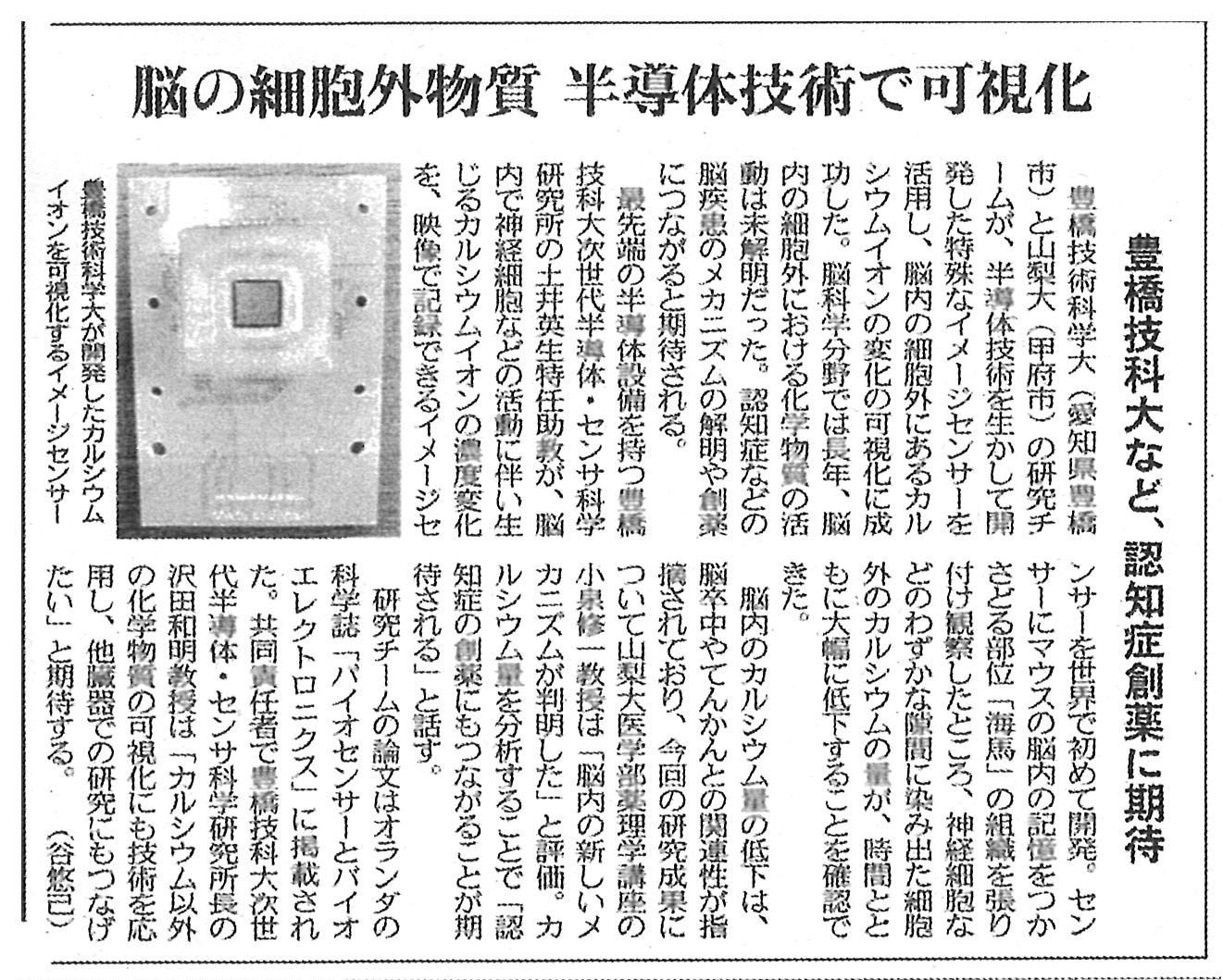 中日新聞「脳の細胞外物質 半導体技術で可視化」